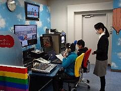 スタッフの皆さんから説明を聞き、役割ごとにスタジオでの体験をしました。こどもニュースのキャスターやお天気キャスター、撮影現場の進行をするFD(フロアー・ディレクター)、音声などの技術を担当するTD(テクニカルディレクター)、演出を担当するPD(プログラムディレクター)などに挑戦しました。青い背景の前でジャンプをすると、別の場所に移動するクロマキーなども体験してきました。