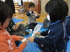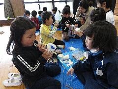 図工の「なにがでてくるかな!?」という学習活動を、1年生が優しくリードして行いました。透明の袋にマジックで絵を描き、それを紙コップに入れてストローで息を吹き込むと膨らんでくるおもちゃを、年長さんと1年生が一緒に楽しく作りました。
