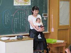 ハムスターのお母さんがどんな思いで赤ちゃんを産み、子育てしているかを考えました。サプライズで、4月に男の子を出産され育休中の永山教諭が来てくれ、お腹に赤ちゃんがいるときの思いや、お腹の赤ちゃんに毎日話しかけ、赤ちゃんも答えてくれたこと、元気に産まれてきてくれた喜びなどについて話をしてくれました。子どもたちは、真剣に話しを聴いていました。