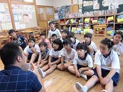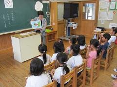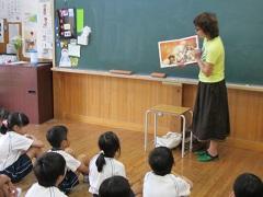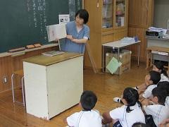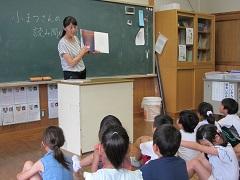 1年生は中山さんが「アリとハト」、「へっこきよめさま」、「かもとりごんべえ」を、2年生は石河先生が「ひつじぐものむこうに」、「また!ねずみくんのチョッキ」を、3年生は松尾さんが「たなばたむかし」、「わたしゆきおんな」を、4年生は三武さんが「ストライプ」、「あっほっ」を、5年生は樋口先生が「片耳の大鹿」を、6年生は大塚先生が「こころにすむおおかみ」、「ゆうれいなっとう」を読んでくださいました。