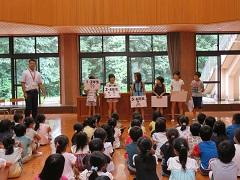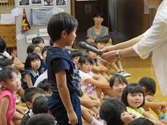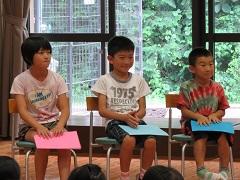 その後、1年生の町井寿希さん、2年生の平野涼介さん、3年生の杉本紗怜さんが、「1学期に頑張ったことと夏休みの抱負」を元気に発表できました。今回は、4名の児童から感想や質問が出されました。