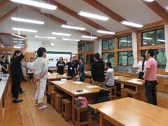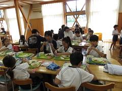 金澤栄養教諭からのご指導のあと、順に並んでバイキング給食が始まりました。後の人のことを考えて遠慮がちに取ったため、最初はたくさん残りました。お代わりも遠慮気味でしたが、だんだんペースが上がり、皆よく食べました。海浜自然の家でも安心です。