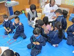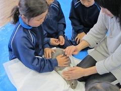 獣医師の高野亨先生と小菅博康先生のご指導で最初は、おっかなびっくりだった子どもたちが、進んで触れるようになりました。ウサギと人間の同じ所、違うところを見つけたり、聴診器で自分や友だちの心臓の音とウサギの心臓の音を聞き比べたりしました。