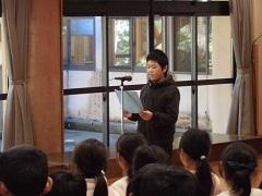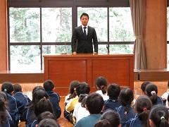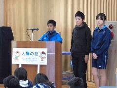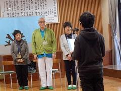 終了式は環境飼育委員の6年生が進行し、人権擁護委員の永井さんからお話をしていただきました。環境飼育委員長の小野寺賢さんが、児童を代表してお礼と今後の決意を述べ、人権擁護委員の方からクリアファイルをいただきました。