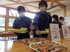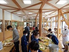 金澤栄養教諭からのご指導のあと、順に並んでバイキング給食が始まりました。後の人のことを考えて遠慮がちに取ったため、最初はたくさん残りました。お代わりも遠慮気味でしたが、だんだんペースが上がり、皆よく食べました。海浜自然の家でも安心です。