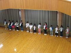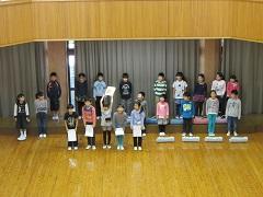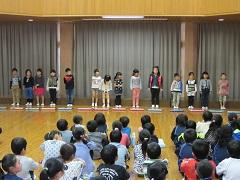 最初に1年生が「うみ」を身振り付きで歌いました。次の「なかよし」は鍵盤ハーモニカを上手な指使いで演奏できました。「まねっっこカスタネット」は最初、先生のリズムを1年生がまねて、その後は全児童が1年生のまねをしました。