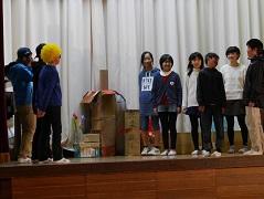 清掃時間の終わり頃に地震が起き、火災が発生したという想定です。約3分で全員が避難できました。