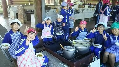 8時からアスレチック広場で自由活動、9時から班ごとのカレーづくりと順調に活動しています。肉と野菜を炒めずに煮込み始めた班や、カレールーを先に入れてしまった班もありましたが、出来上がりは上々でした。完食した班がたくさんありました。