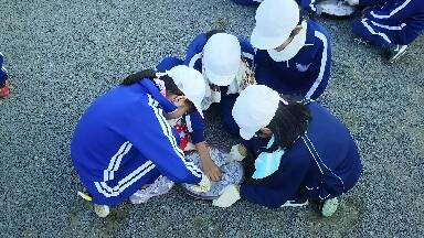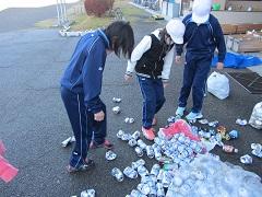 環境飼育委員の子どもたちが、朝早くから缶をつぶしたり、大きな網の袋に入れたりと頑張っていました。最初のスクールバスで登校する4年生の女子2名は、早朝の冷気の中、暑くなるほど頑張り、半袖・ハーフパンツで活動していました。