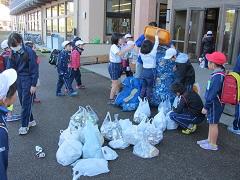 環境飼育委員の子どもたちが、朝早くから缶をつぶしたり、大きな網の袋に入れたりと頑張っていました。最初のスクールバスで登校する4年生の女子2名は、早朝の冷気の中、暑くなるほど頑張り、半袖・ハーフパンツで活動していました。