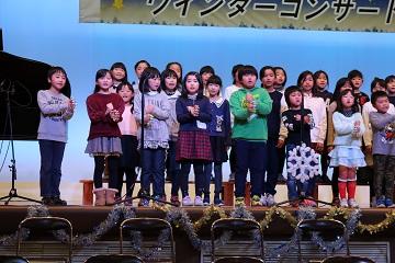 児童の出番は、第2部合唱の部~みんなで歌おう~でした。認定こども園市貝たいよう幼稚園の年長児のステージに続いて、町内3校の小学生が登場しました。3校の子どもたちが息を合わせて「あわてんぼうのサンタクロース」「スマイルアゲイン」を元気に、そしてあふれる笑顔で歌い上げました。恒例のプレゼント抽選会もあり、抽選に当たった児童もいたようです。