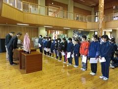 校長からは、長い2学期、学習だけでなく様々な行事でも一生懸命に頑張ったことを称えました。校長が目にした、「それぞれの場面で何かに気付き、自分でどうしたらよいか考え、そして行動できた」子どもたちの姿を4つ紹介し、心も頭も体も成長し、一歩前進できたことを確認しました。年末年始、日本の伝統行事を通して家族で仲良く過ごし、新年の抱負を一緒に考え、1月9日の始業式に、元気に登校してほしいと伝えました。