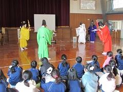 杉山太々岩戸神楽保存会の皆さんに来ていただき、演目「五行の舞」を見せて頂きました。太々神楽の歴史や、使う道具(楽器やお面など)、演目「五行の舞」につて、分かりやすく説明していただきました。また、般若やひょっとこなどのお面もかぶらせてくださいました。