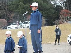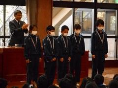 式後の児童指導の話しでは、小野口教諭と5年バレー部で「こう・ゆう・すい・か」の合い言葉と、お年玉の貸し借りをしないことについて、役割演技を交えて説明がありました。