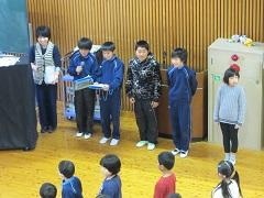 恒例の代表児童の作文は、1年生の大根田瑛斗さん、2年生の髙松風羽さん、3年生の永野凜さんが、2学期の反省と冬休みの抱負について、落ち着いて発表しました。小貝っ子タイムではたくさん手が挙がりましたが、4名が指名され、感想を発表しました。