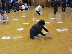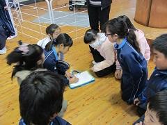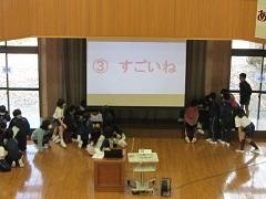 ゲームは仲良し班ごとに集まり、床に置かれたカードに書かれた16種類の「ふわふわ言葉を」低学年児童から順に覚えてきて、記録用紙に記入するという簡単なゲームですが、聞こえてくる言葉がすべて優しい「ふわふわ言葉」だったせいか、会場中がとても温かな雰囲気に包まれていました。
