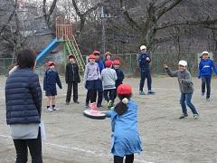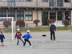 事前に縦割り班ごとに考えてあった遊びを、班長さんが中心になって進めました。班員みんなで協力して足でコートを書いて、ドッチボール、ドッチビー、野球などで楽しみました。