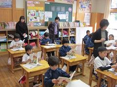 1年生は小松さんが「十二支のおはなし」「あらまっ!」を、2年生は松尾さんが「おおきくなるっていうことは」「さんにんサンタ」「おならしゃもじ」を、3年生は三武さんが「メリークリスマスおおかみさん」「あっ・ほっ」「ホップアップ絵本の紹介」を、4年生は大貫さんが「100人のサンタクロース」「からあげ」を、5年生は皆川さんが「王さまになった羊飼い」を、6年生は仲山さんが「心ふくらむおはなし(五郎の決心)」を読んでくださいました。