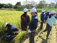9月25日(水)、アグリ体験学習として、市貝小学校、赤羽小学校の5年生と一緒に稲刈りをしました。はじめて稲刈りをする児童もいましたが、とても手際よく刈ることができました。