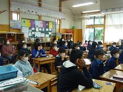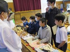 2月7日(金)に、3年生が社会科の「のこしたいもの つたえたいもの」の学習で、杉山太々神楽保存会の方をお迎えして、「五行の舞」を実演していただいたり、楽器や面を触らせていただいたり、太々神楽に込められた願いや保存への思いをお話いただいたりしました。児童は、真剣なまなざしで実演を見て、地域の人々が受け継いできたものを保存・継承することについて考えることができました。杉山太々神楽保存会のみなさま、本当にありがとうございました。