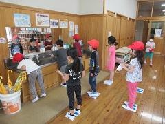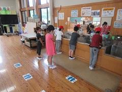 5月28日(木)、1・3・5年生が登校しました。新型コロナウイルス感染症対策のひとつとして、児童一人一人にソーシャルディスタンスの意識づけをするため、手洗い場を1つ空け、並ぶ場所に足形をつけました。
