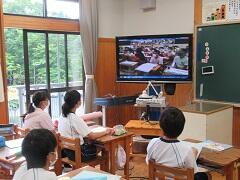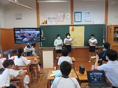 7月9日(木)、宮古島市の結の橋学園(伊良部島小学校)との遠隔地交流授業を5・6年生が行いました。「さしば」が取り持つ縁で、昨年度は本校児童数名が宮古島を訪問したり、遠隔地交流授業を行ったり、社会のゲストティーチャーとして伊良部島小学校の先生が本校においでいただいた際に授業を行っていただいたり、と交流を続けてきました。本来であれば3月に5年生同士で1年間総合で学習してきた「さしば」を中心に調べてきた水、森林、生態系などについて、お互いに遠隔地交流授業として発表する予定でしたが、休校となり延期されていました。そこで、これから学ぶ5年生も一緒に参加して、遠隔地交流授業を行うこととなりました。まとめたものを上手に発表したり、お互いに質問し合うなど充実した授業となりました。今後は、5年生同士で遠隔地交流授業を進めていく予定です。