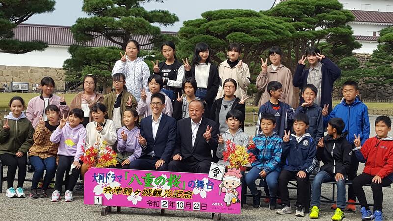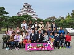 赤べこ絵付け体験 鶴ヶ城の前で記念写真撮影