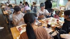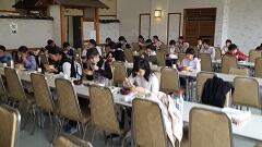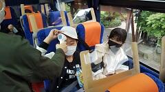 飛沫感染防止のため、おしゃべりをしないで昼食を食べました。朝早かったせいか、みんなもりもり食べていました。午後の予定は、会津武家屋敷、飯盛山、野口英世記念館です。バス乗車時に、アルコール消毒液での手指の消毒と非接触型体温計での検温をし、新型コロナウイルス感染症予防対策をしています。