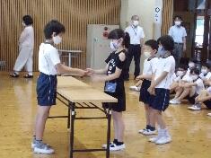 7月16日(金)業間の時間(10:05~10:25)に賞状伝達を行いました。県のバレーボール大会やバドミントン大会で優勝した児童の表彰を行いました。また、学年ごとに決められている必読図書を全部読んだ児童に対して表彰を行いました。6年生の図書委員長から読破賞の缶バッチを手渡しました。授与させた児童に対して大きな拍手を送りました。