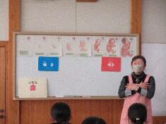 2月13日(月)1・2年生が、食について勉強しました。栄養教諭の平野先生に来ていただき、3時限目に1年生、4時限目に2年生が、人間の身体に必要な栄養について、給食の献立を例にして詳しく教えていただきました。また、食べるときに気を付けることなど紙芝居で教えていただきました。「苦手な野菜も少し食べてみる」など、子どもたち一人一人目標をもったようです。