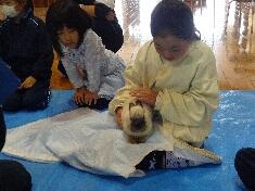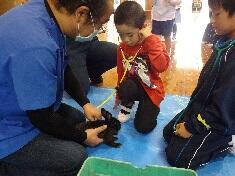 ◎1年生が小動物とのふれあい授業として、宇都宮動物園からうさぎをお借りし、ふれあうことができました。獣医師の先生の指導の下、ウサギを抱いたり、心音を聞いたりしました。思った以上にうさぎは温かく、心臓が早く動くことに驚いていました。「ふわふわでかわいい」という子どもたちからの声が多くありました。