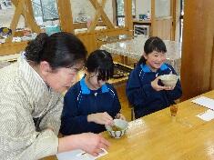 2月15日(木)6年生が、茶道、日舞体験をしました。日舞体験では、扇での表現の仕方について教えていただき、茶道体験では、茶道の歴史や茶をたてる作法などを教えていただきました。和菓子を食べて、そして自分で茶をたてて飲んでみました。みんな笑顔で有意義な体験をすることができました。