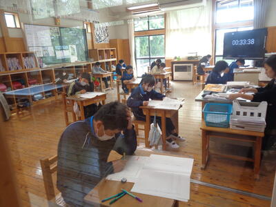 4年生、こちらも音読劇の練習。上手に 様子を読み取って表現していました。(明日は国語の予定で、おうちの方にも見ていただく予定です。)