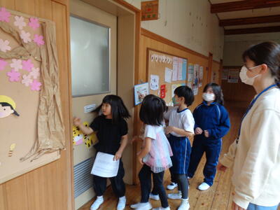生活科の学習で 学校探検をしました。2年生が1年生一緒に班ごとに分かれて、各教室の紹介をしました。1年生もいろいろな教室があることを知りました。