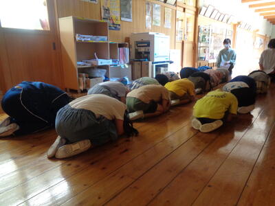 5月22日(水)本日、避難訓練をしました。竜巻を想定して、学校内の安全な場所にて「ダンゴムシ」の形で避難しました。(頭や首を守る姿勢が取れました。)
