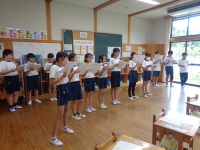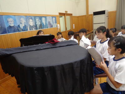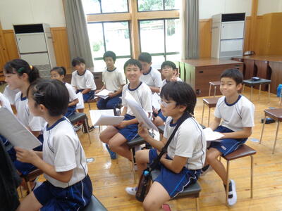 5,6年生はパートに分かれての合唱練習、きれいな歌声でした