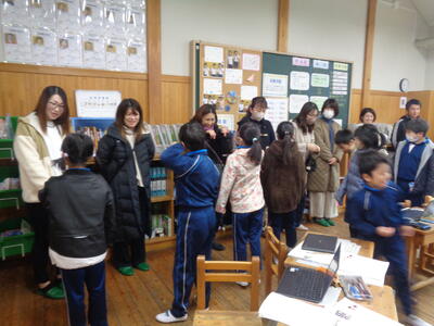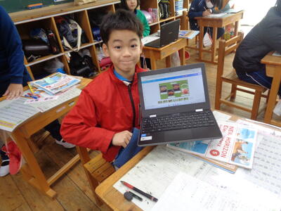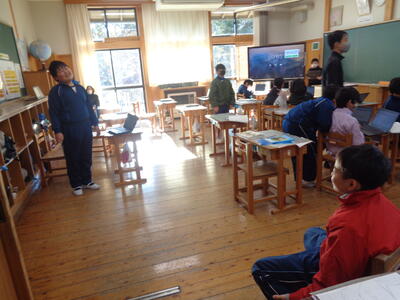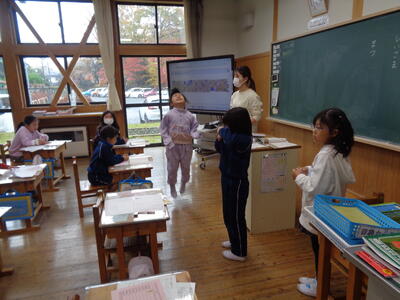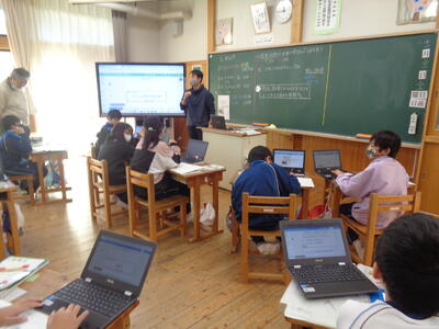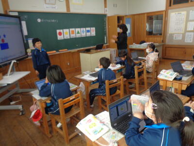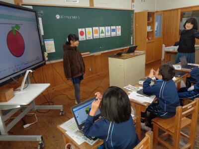 2年生 ICT指導の先生とプログラミングで動かすアニメーション体験をしています。