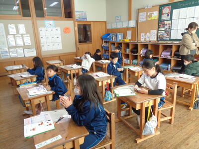 2年生は国語で かさじぞうを動作化しながら様子を読み取っていました。