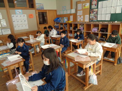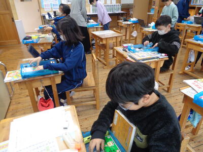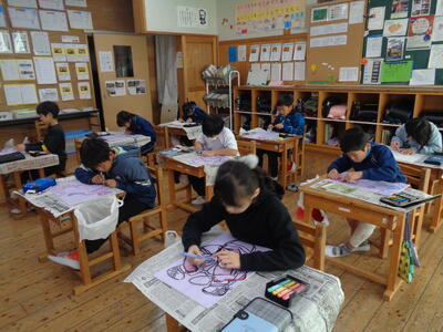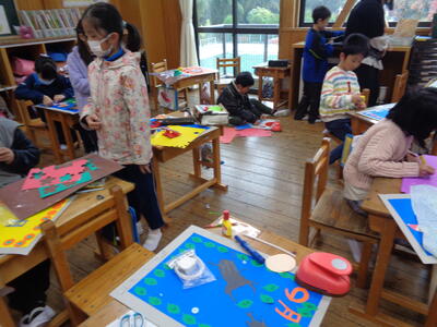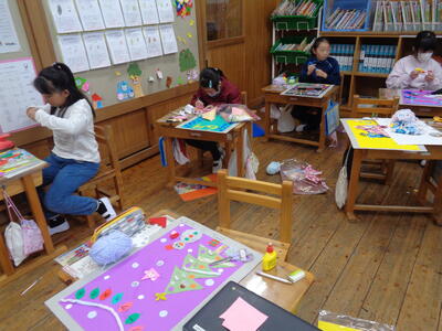 3年生 図工↑それぞれの思いを形にして色の配置や合わせ方、形や切り方の工夫をしていました。