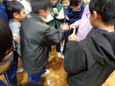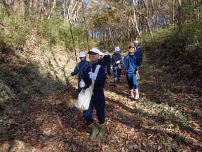 里山は人の手を入れて整備していかなくてはならないこと、日本の生態系を守っていくための活動の大切さ等を教えてもらいました。(昔は炭や薪などにするために木を切り出したり、枯れ葉は堆肥にするために集めていたりしたので、里山は整備されていたとのこと。今とはずいぶん違うことが学習できた5年生です。)