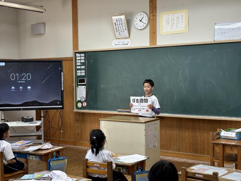 本日、環境福祉委員会の児童が各教室をまわり、来週から募金が始まることを呼びかけました。