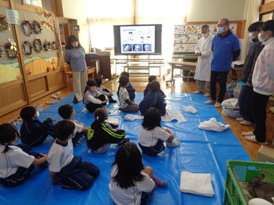 獣医師の高野先生、小菅先生、茂木中で職業体験をしている2名の中学生、町のこども未来課の担当者様2名が来校しました。