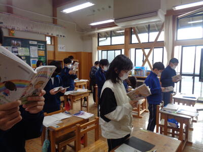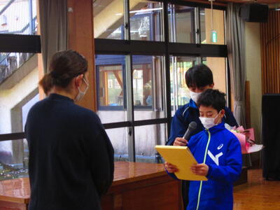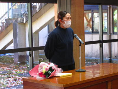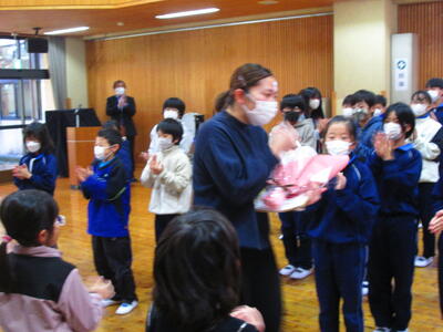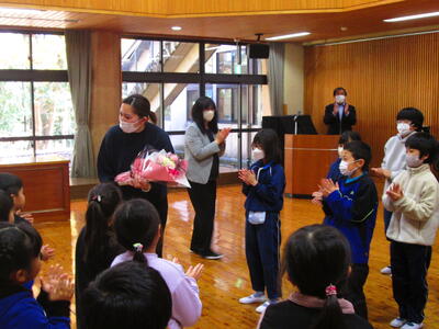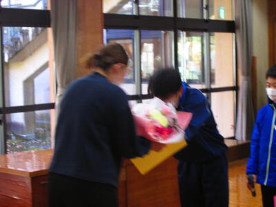 6年生代表者から感謝の手がみ朗読と花束の贈呈がありました。