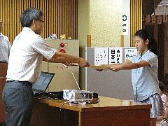 その後、校長が「あいさつ」のすばらしさについて話しました。あいさつは自分も相手も幸せな気分にする。あいさつをしても、相手から返って来ないと寂し気持ちになるけれど、気にせずに自分が気持ちよく元気になるために、素敵なあいさつをしていきましょうと話しました。そのために、あ:あいての顔を見て、い:いつでもどこでも、さ:ひとよりさきに、つ:つねに気持ちを込めて を心掛けるように呼びかけました。