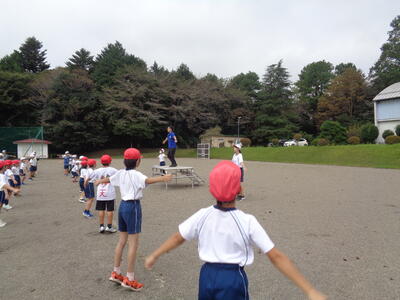 1~3年生は校庭で運動会の練習。