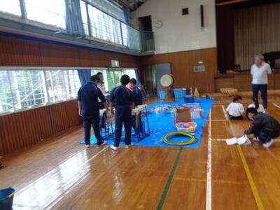 業間の係打合せ。明日の予行に向けて準備係は入念に確認中。