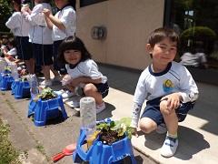 種を蒔き、間引きをして、早く咲かないかと楽しみにしていた朝顔です。ベランダの外のポットで開いた青やピンクの朝顔を、子どもたちと先生方が嬉しそうにながめています。道徳との関連は「自然愛護」です。
