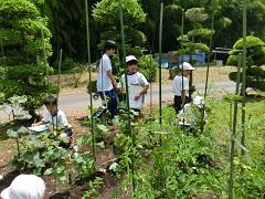 毎日登校すると、走って水やりに来ている2年生です。草がはびこったときに、栄養をみんな草にとられてしまうね。と話すと、数日後には、すっかり草が無くなっていました。子どもたちが自分たちで草取りをしたようです。また、虫がいると心配し、もぐらが穴を掘ってると気にしながら大切に育てた野菜です。もう、とっても大丈夫だと思うよ。どうする?と聞くと、嬉しそうにとってくださいと返事が返ってきます。大きなキュウリ、真っ赤なトマト、紺色のパプリカ、ふくらんだ枝豆など、毎朝が楽しみです。道徳との関連は「希望と勇気、努力と強い意志」です。