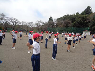 紅白に分かれて ラジオ体操の練習をしました。