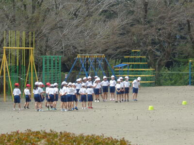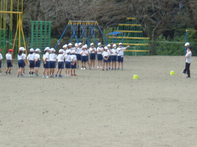 1~3年生は校庭で運動会の練習。